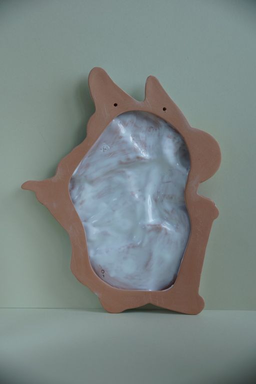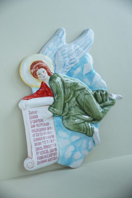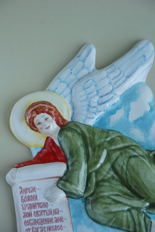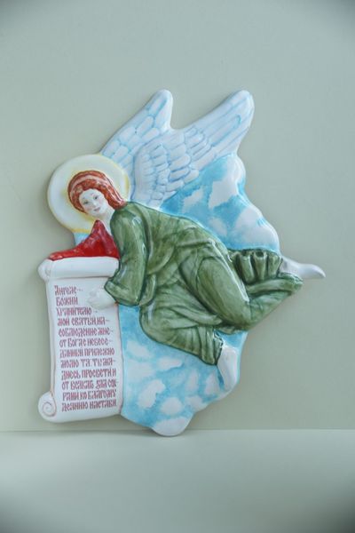 Красивое керамическое панно в виде ангела со свитком.