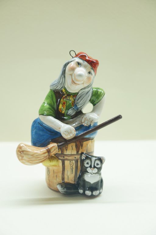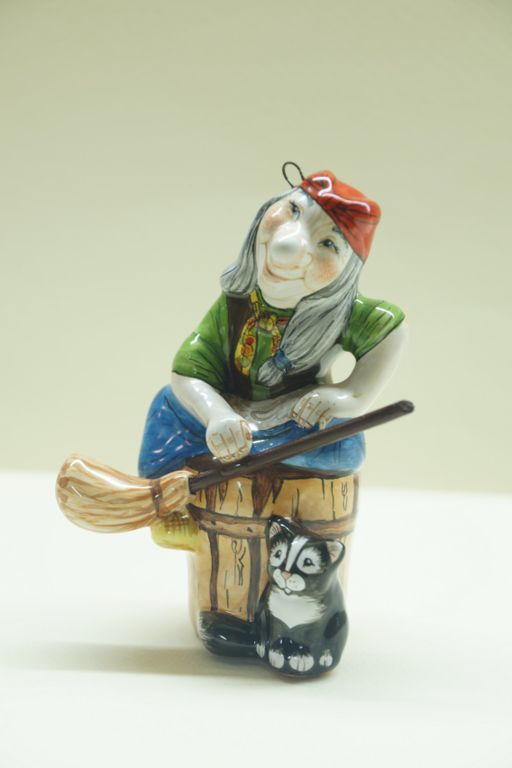Необычная елочная игрушка в виде бабы Яги на ступе с метлой и котенком.