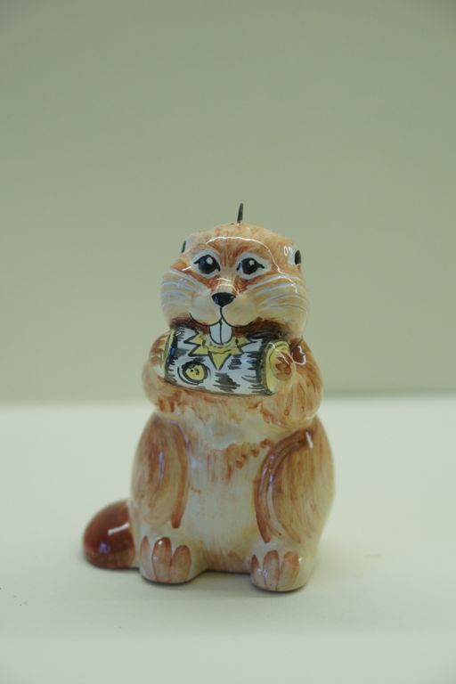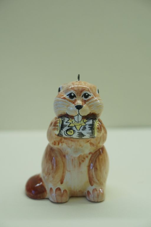 Яркая красивая елочная игрушка в виде веселого лесного бобра.