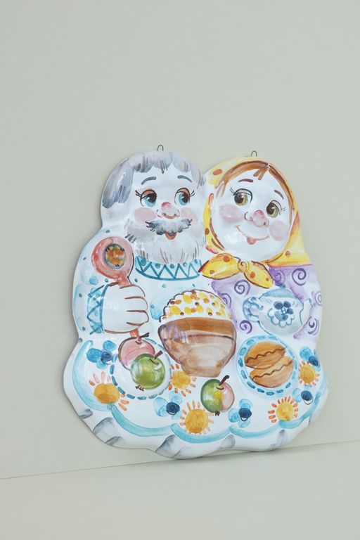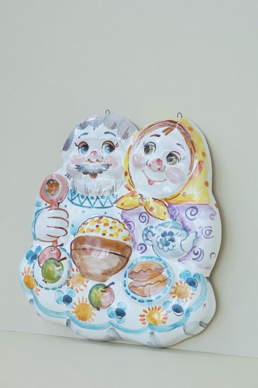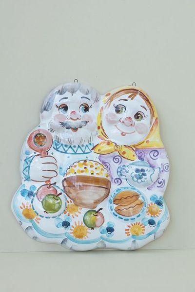 Красивое настенное панно с изображением счастливых деда и бабки, может быть оформлено в различных цветах.