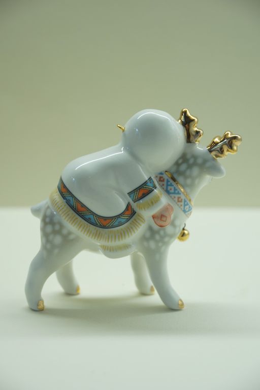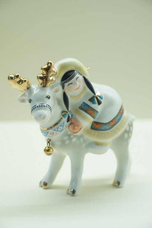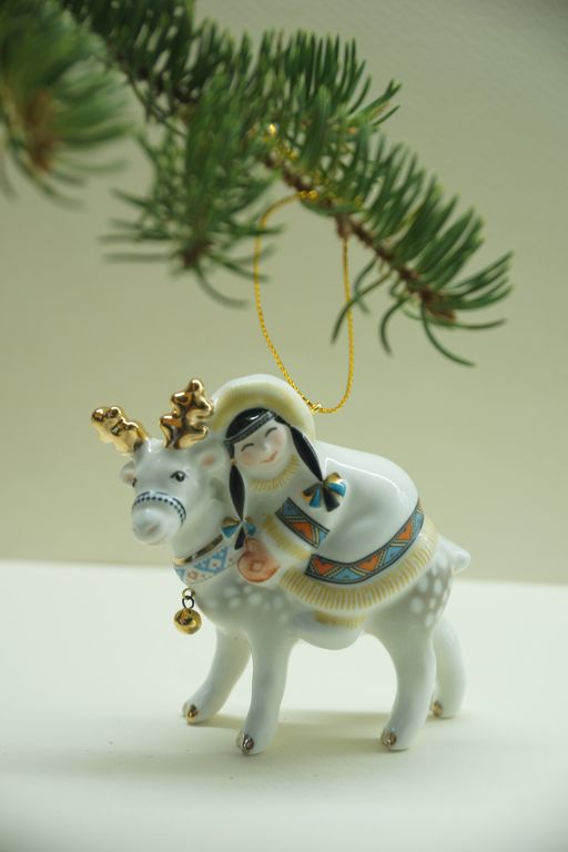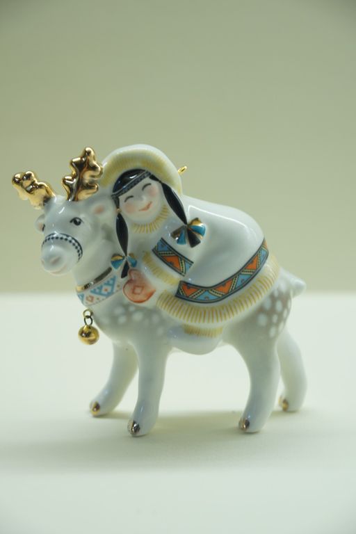 Девочка на олене - яркая фарфоровая ёлочная игрушка.