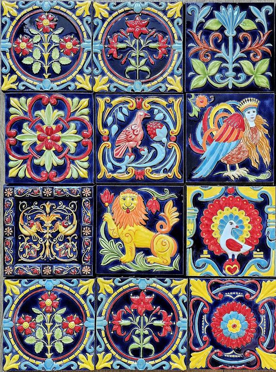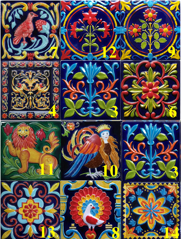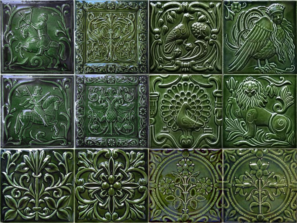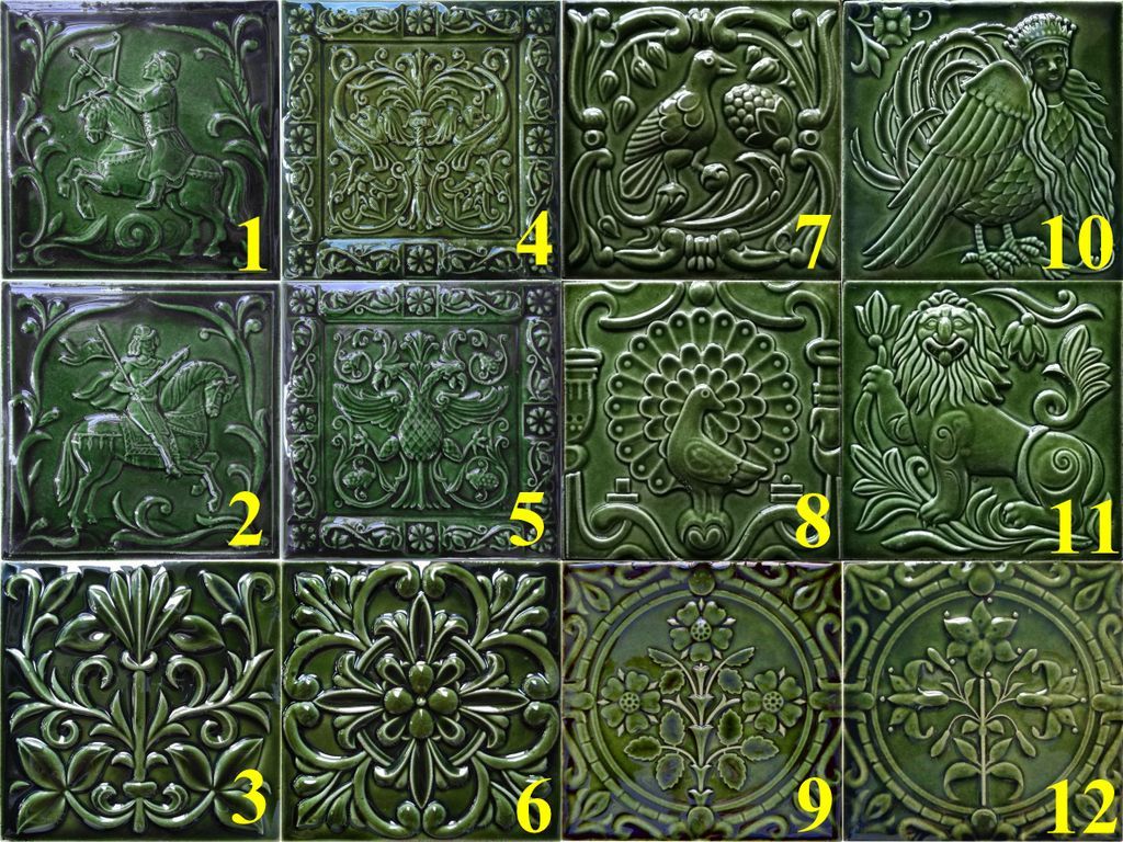Размер каждой изразцовой плитки 15см на 15см. Толщина: 1,5см. В 1 кв.м. - 45 шт. Всего 14 видов: