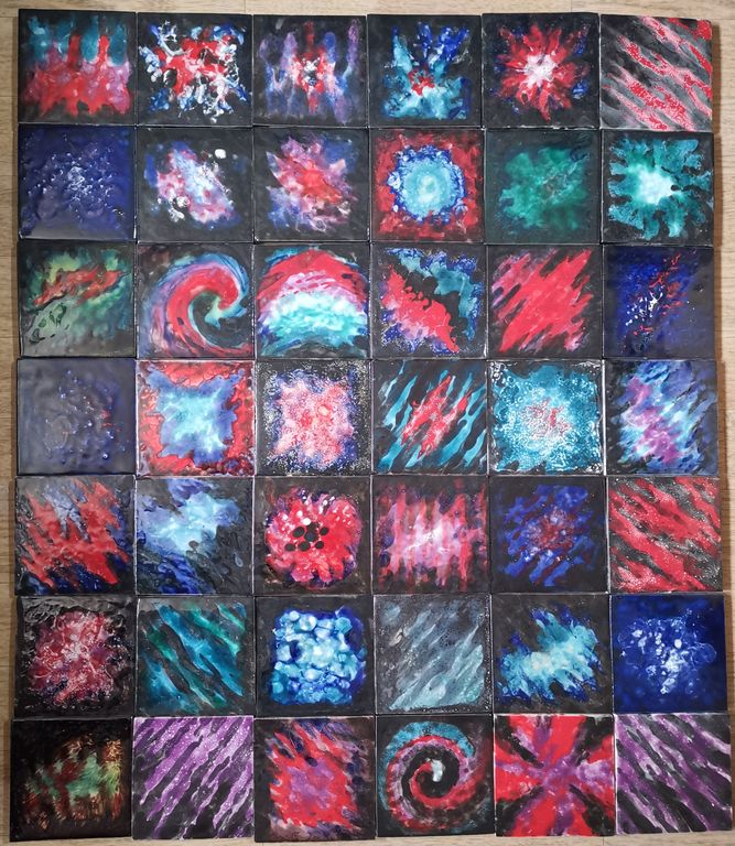 Представленный эффект достигается наложением нескольких слоев эмали с последующим обжигом. Изображения на плитках ВСЕГДА БУДУТ РАЗНЫЕ, так как эмаль при нагревании растекается хаотично.