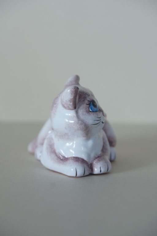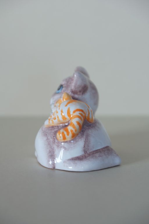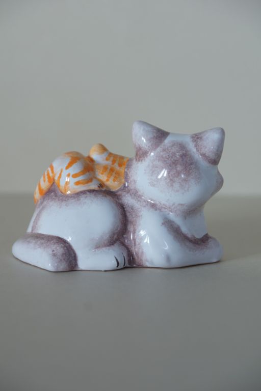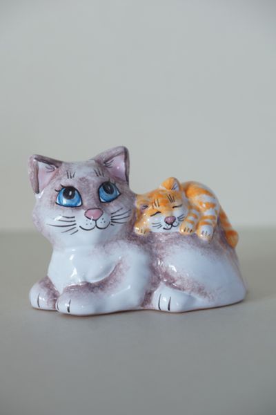 Очаровательная майоликовая фигура в виде кошки со спящим котенком.