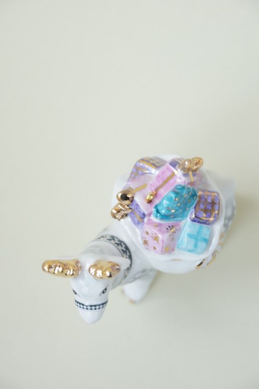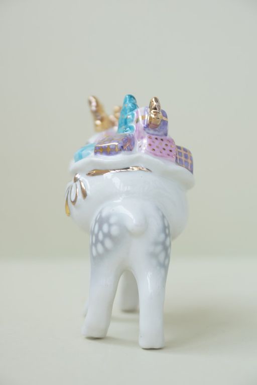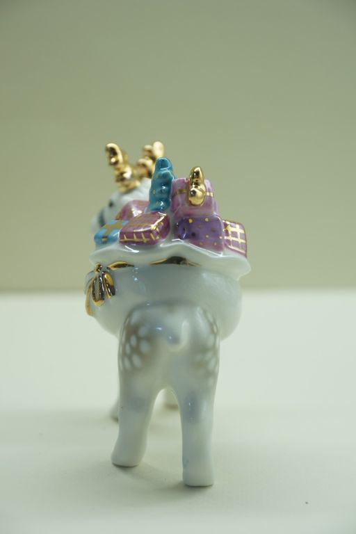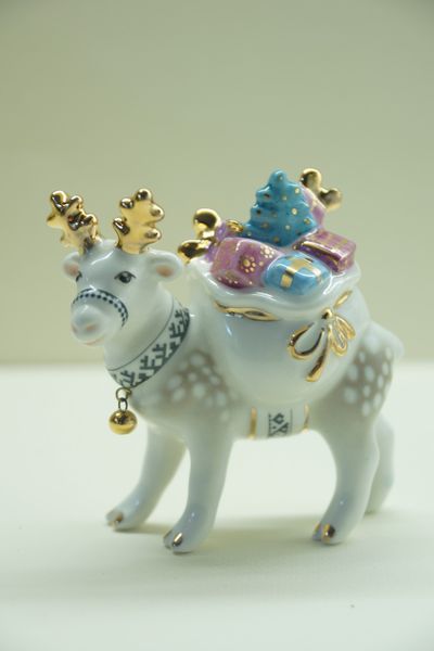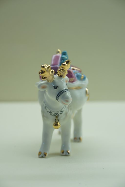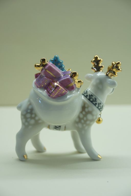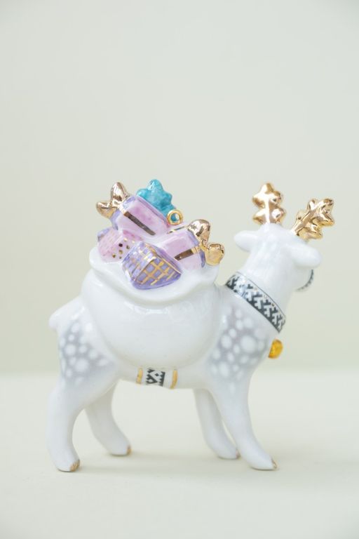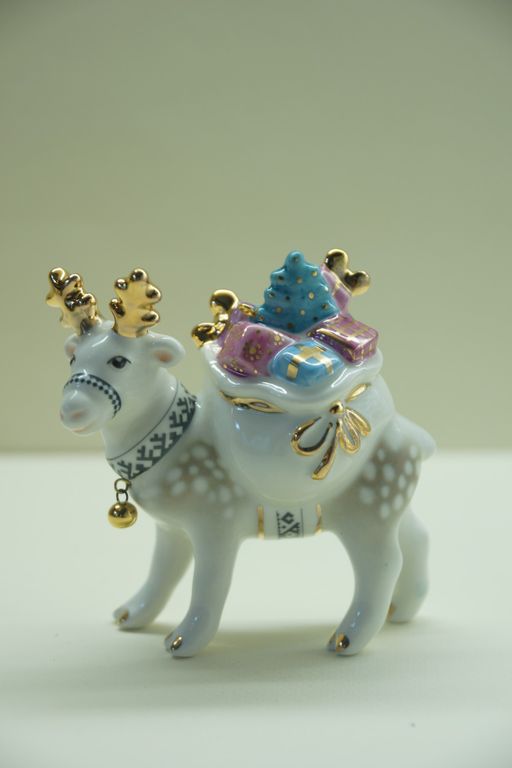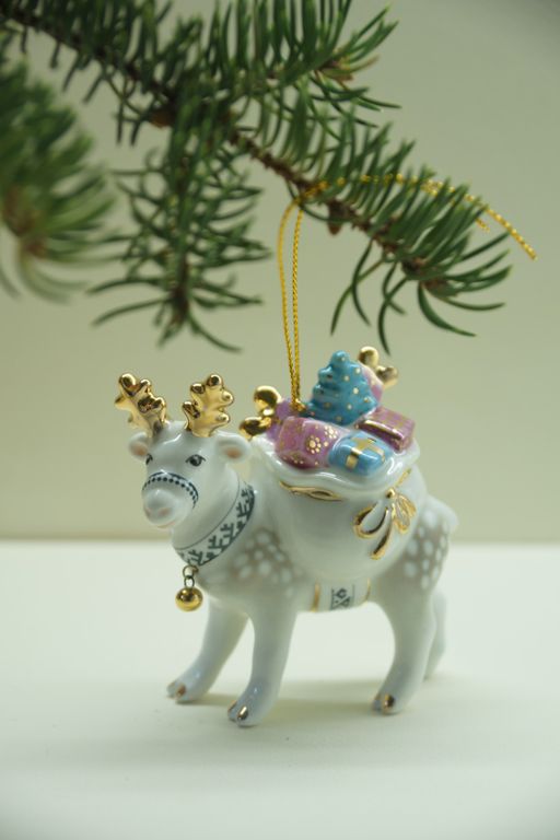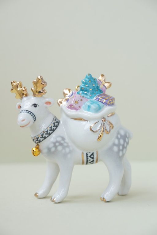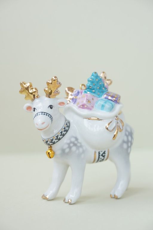 Олень с мешком - яркая фарфоровая ёлочная игрушка.