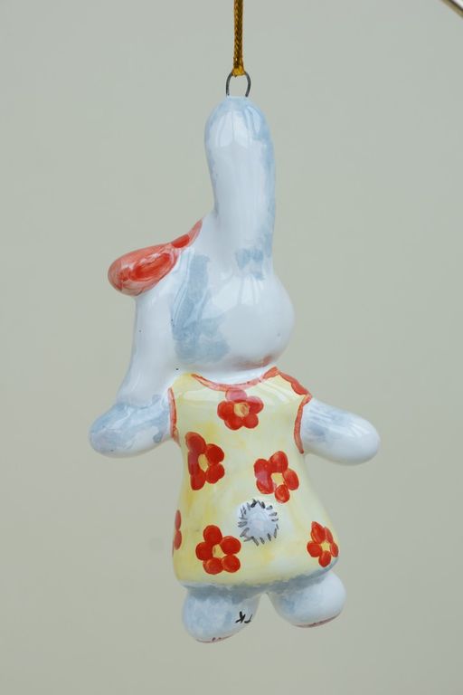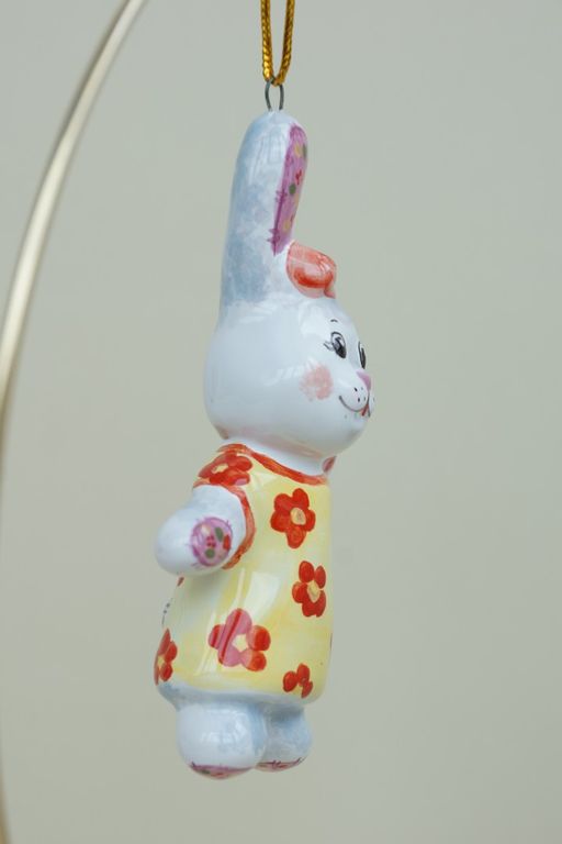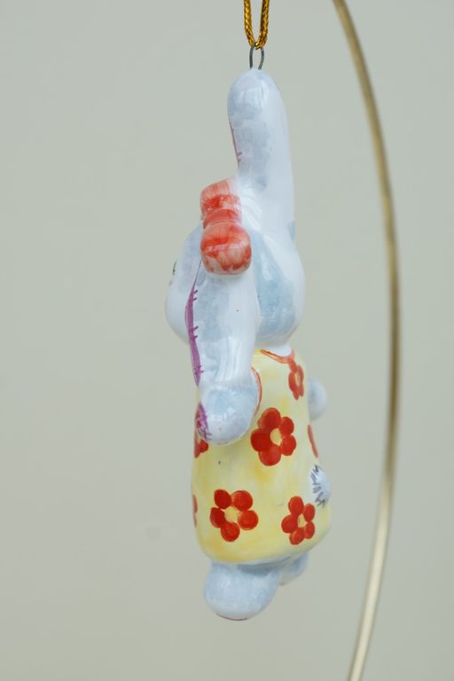 Яркая красивая елочная игрушка в виде плюшевого зайки.