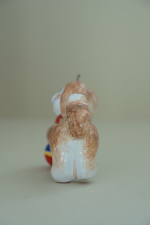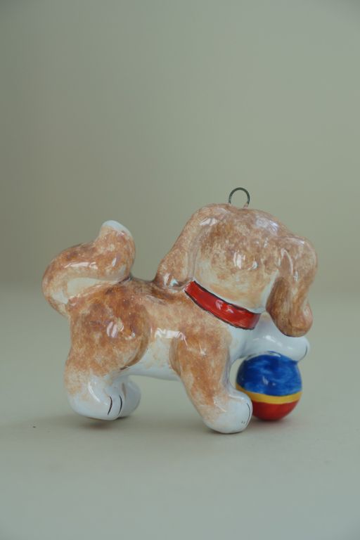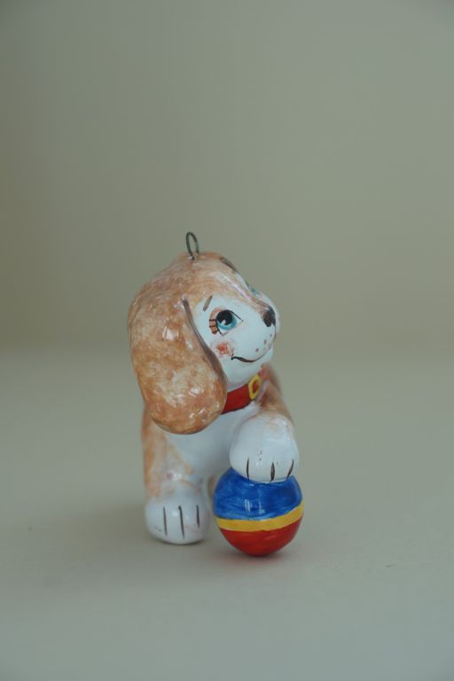 Яркая красивая ёлочная игрушка щенка, играющего с мячиком.