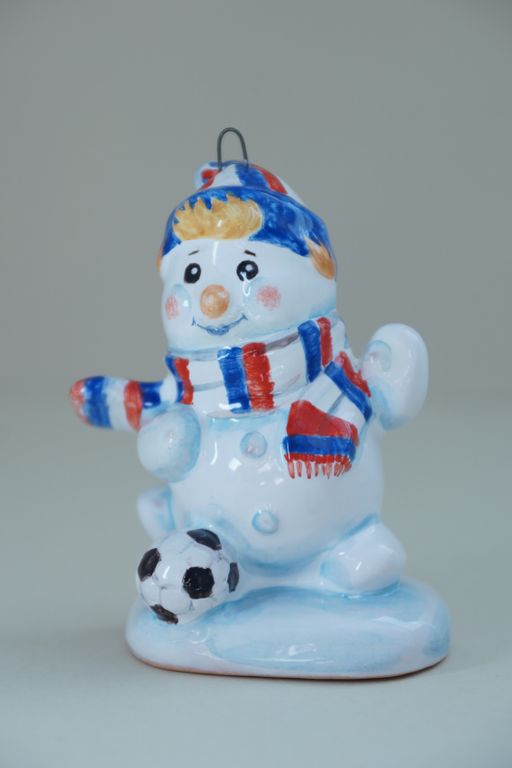 Симпатичная елочная игрушка снеговика-футболиста.