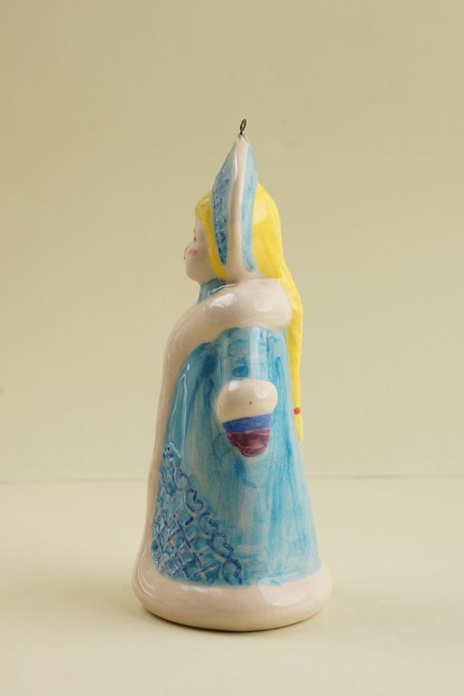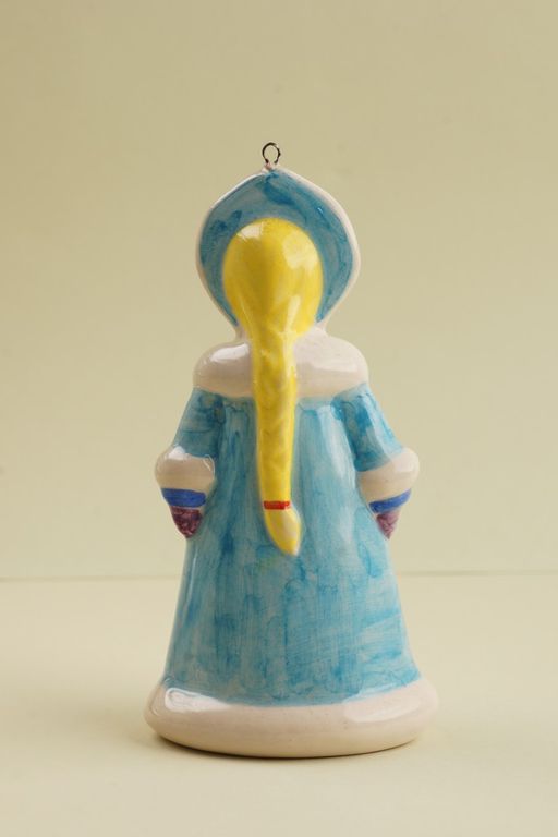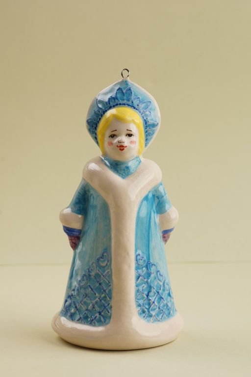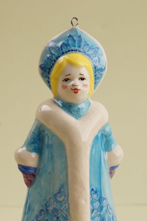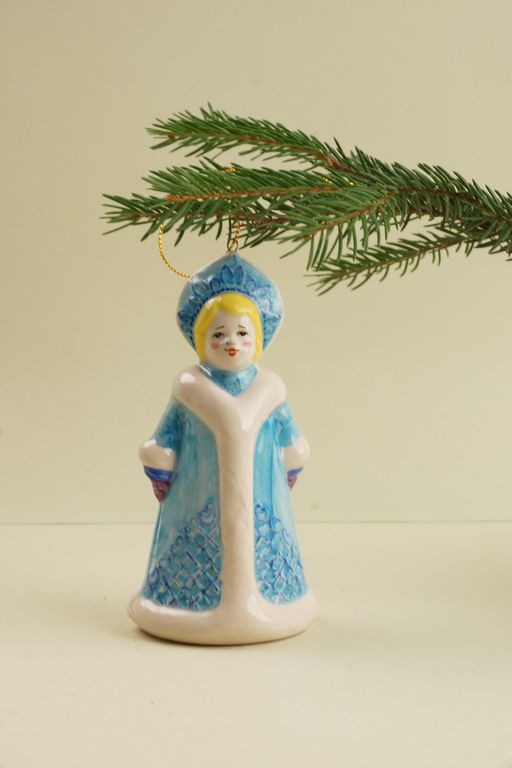 Яркая елочная игрушка в виде снегурочки, спутницы дедушки мороза.